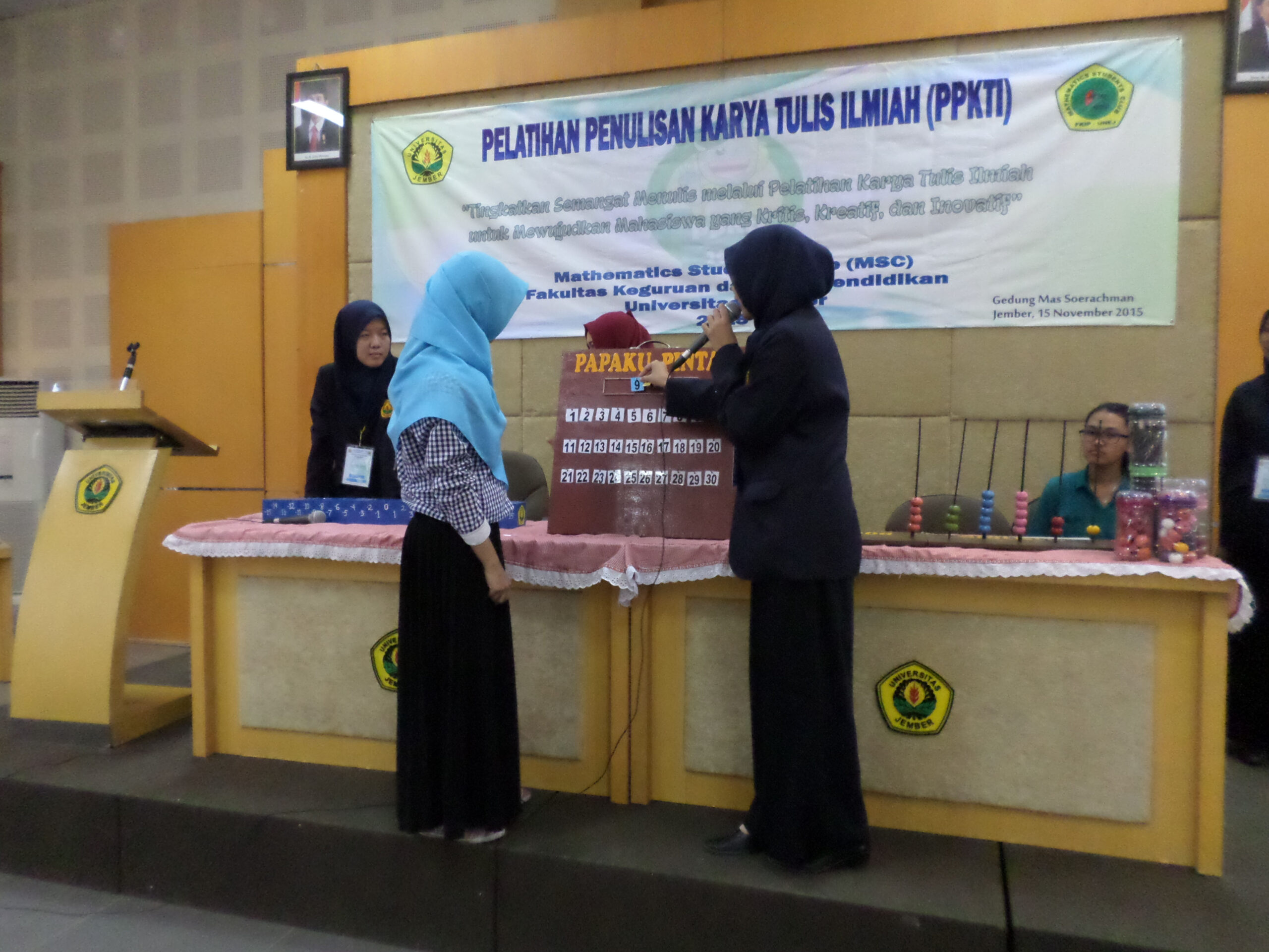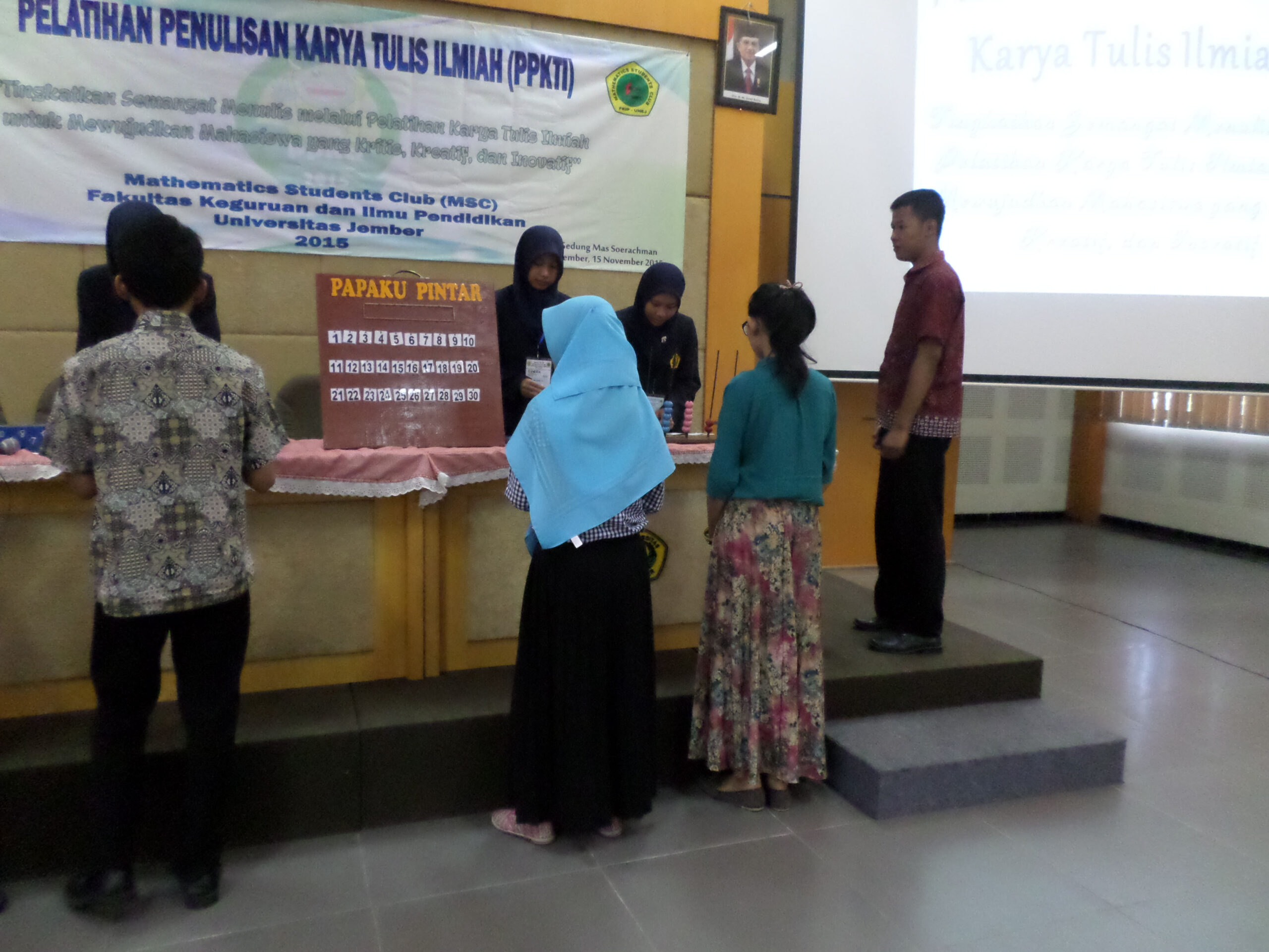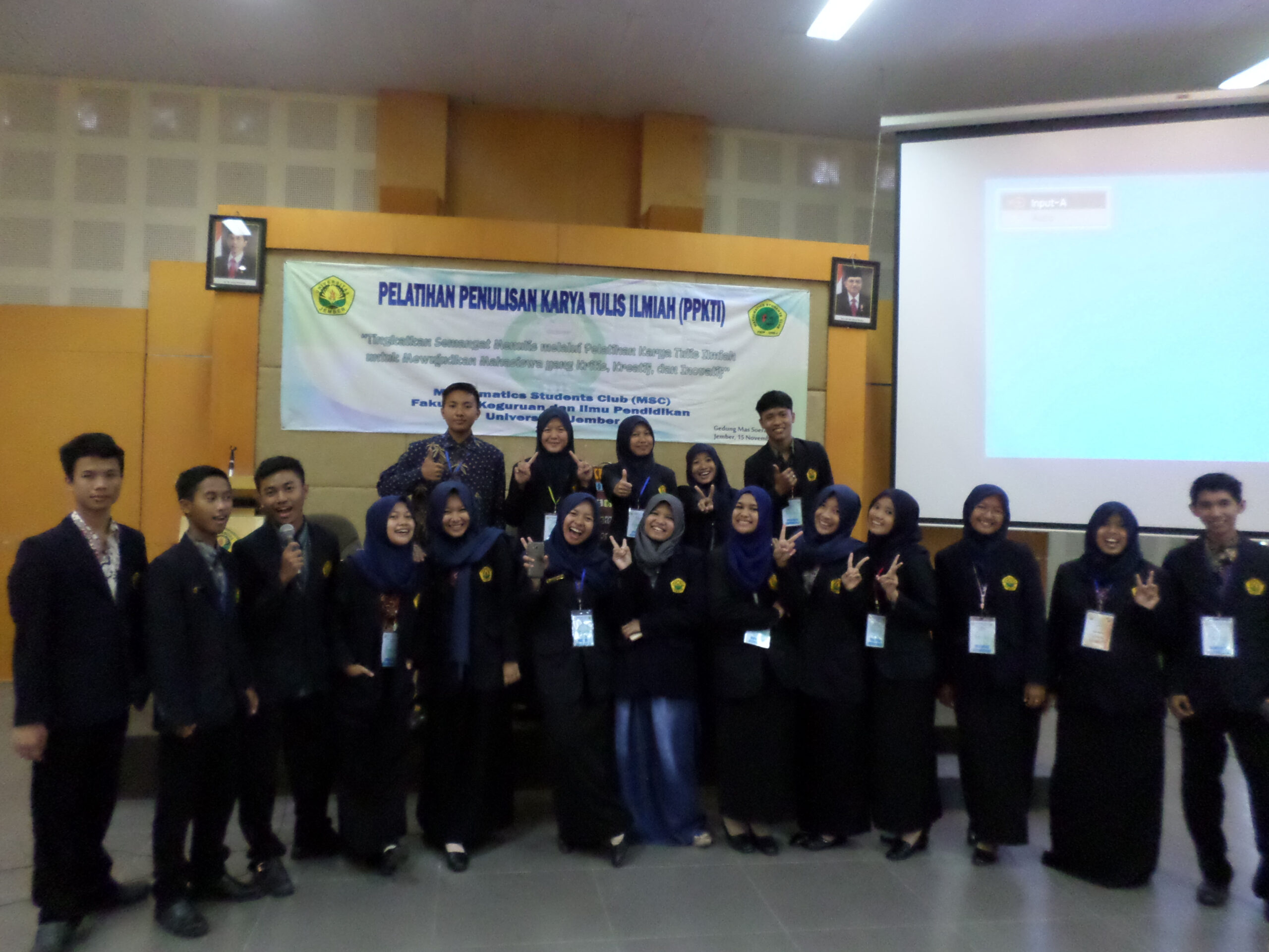 Pelatihan Penulisan Karya Tulis Ilmiah (PPKTI) merupakan realisasi dari program kerja Departemen Penelitian dan Pengembangan (Litbang) Bidang IV HMPS Pendidikan Matematika MSC FKIP UNEJ. PPKTI merupakan kegiatan pelatihan penulisan Karya Tulis Ilmiah yang bertujuan agar mahasiswa baru bisa mengetahui cara-cara maupun aturan-aturan dalam penulisan Karya Tulis Ilmiah. Dimana kegiatan ini ditujukan khususnya kepada mahasiswa baru setiap tahunnya. Pada tahun ini, PPKTI diselenggarakan pada tanggal 15 November 2015 di Gedung Soerachman dengan tema “Tingkatkan Semangat Menulis melalui Pelatihan Karya Tulis Ilmiah untuk Mewujudkan Mahasiswa yang Kritis, Kreatif, dan Inovatif”